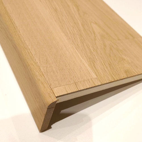 Eikelisten i front (trappenesen) er limt og bygger totalt 60mm fra toppen av parketten (44 mm i underkant av parketten).